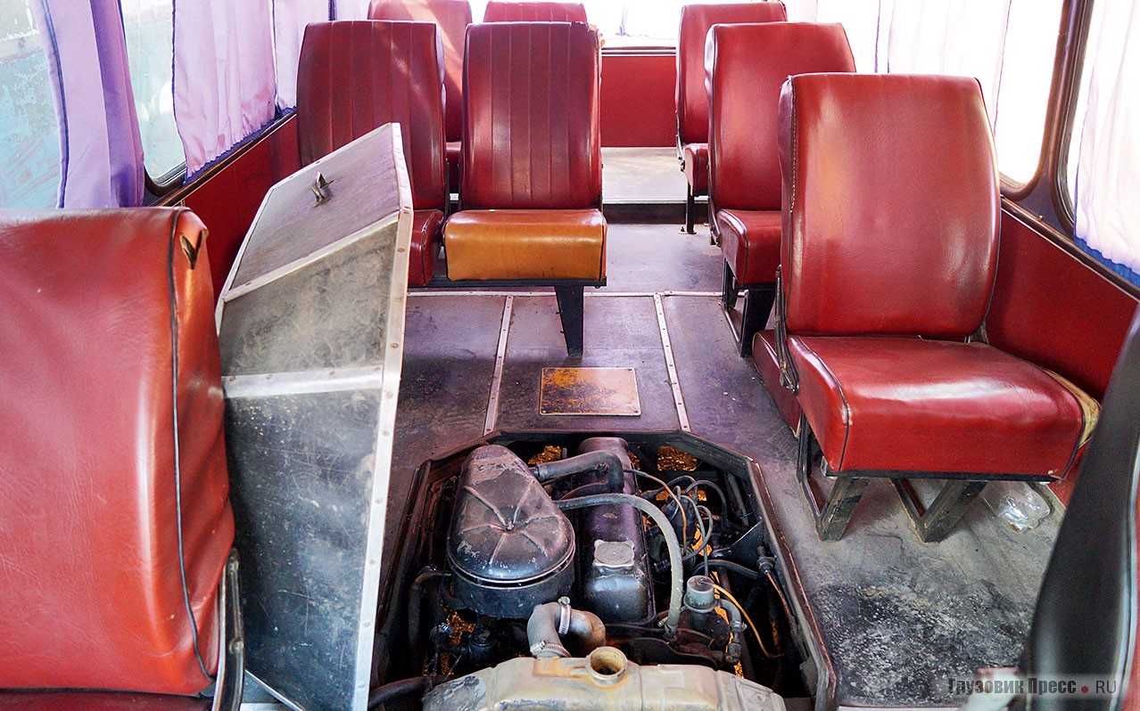 Доступ к двигателю открывается под внушительным кофром, расположенным по центру салона. Он может мешать пассажирам при посадке и высадке, но, с другой стороны, такая компоновка позволяет проводить работы по ремонту и обслуживанию над моторным отделением в любую погоду, находясь под крышей и в тепле. Затруднения может вызвать лишь демонтаж двигателя целиком для крупного ремонта, но и на такой случай предусмотрены решения.