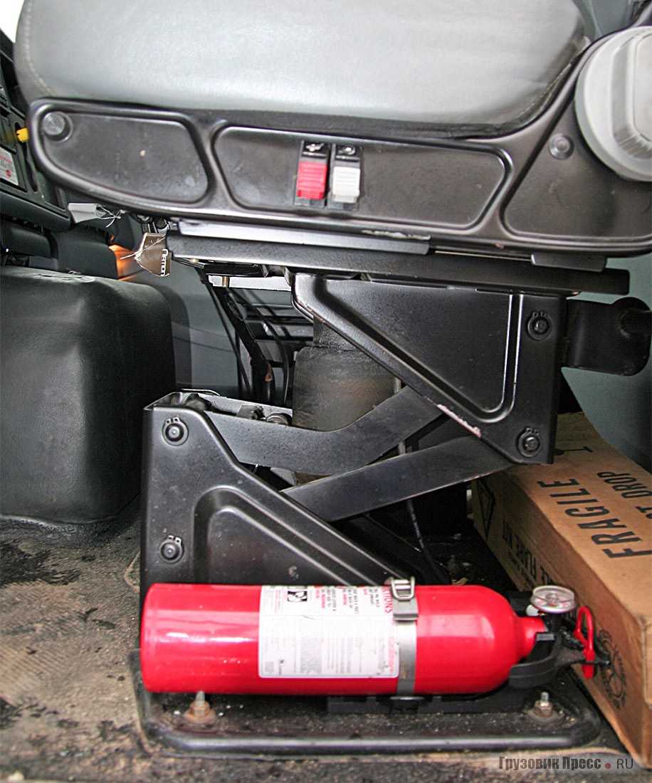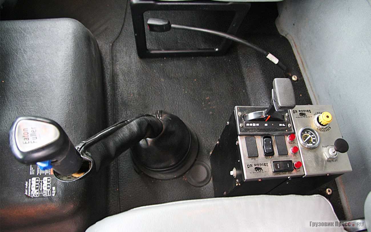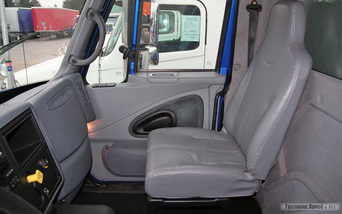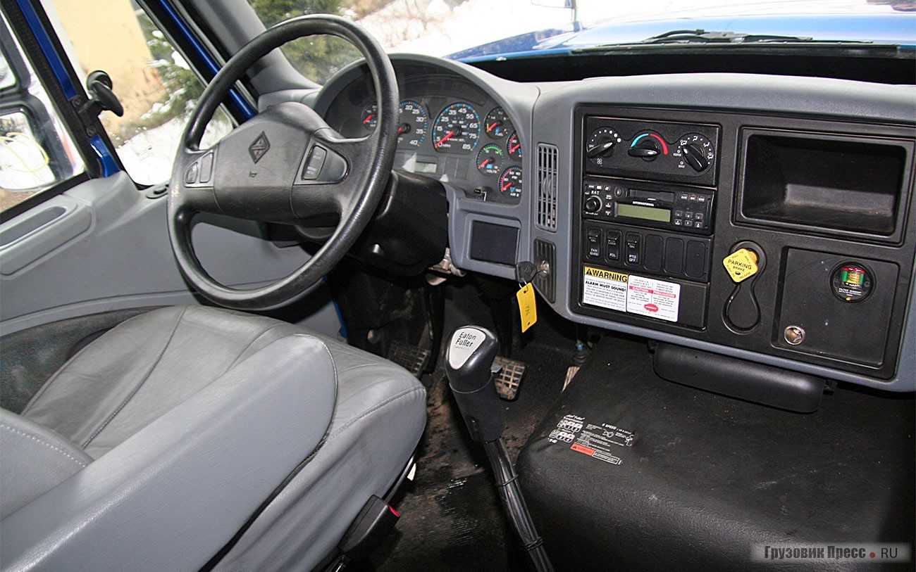 В салоне International 7600 сперва ощущаешь некоторый дискомфорт. Ведь даже несмотря на скромные размеры самосвала хочется почувствовать настоящий американский размах – встать в полный рост, побродить по салону. Но у нас был самосвал с дневной кабиной без спального отсека размером с хрущевку, и по-настоящему развернуться и разогнуть спину не получится. Салон хоть и уютный, но скромных европейских размеров. Несмотря на капотную компоновку часть полезного пространства кабины съедает кожух моторного отсека. У задней стенки кабины примостился блок управления самосвальной надстройкой, массивный и неубиваемый, как контроллер промышленного тепловоза. Между этими препятствиями приткнулась кривая кочерга механической КП. Пересесть с водительского на пассажирское кресло можно обладая лишь определенной сноровкой. Кресло на пневмоподвеске имеет большой диапазон регулировок, обшито дерматином, справа установлен откидной подлокотник. Ну это уже барство! Единственная претензия – сиденье по-американски вальяжно и практически лишено боковой поддержки, отчего на буераках елозишь своей пятой точкой.
