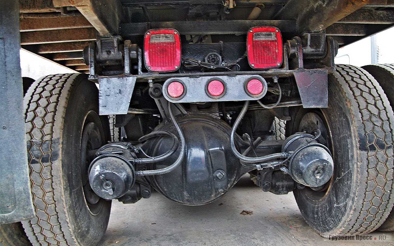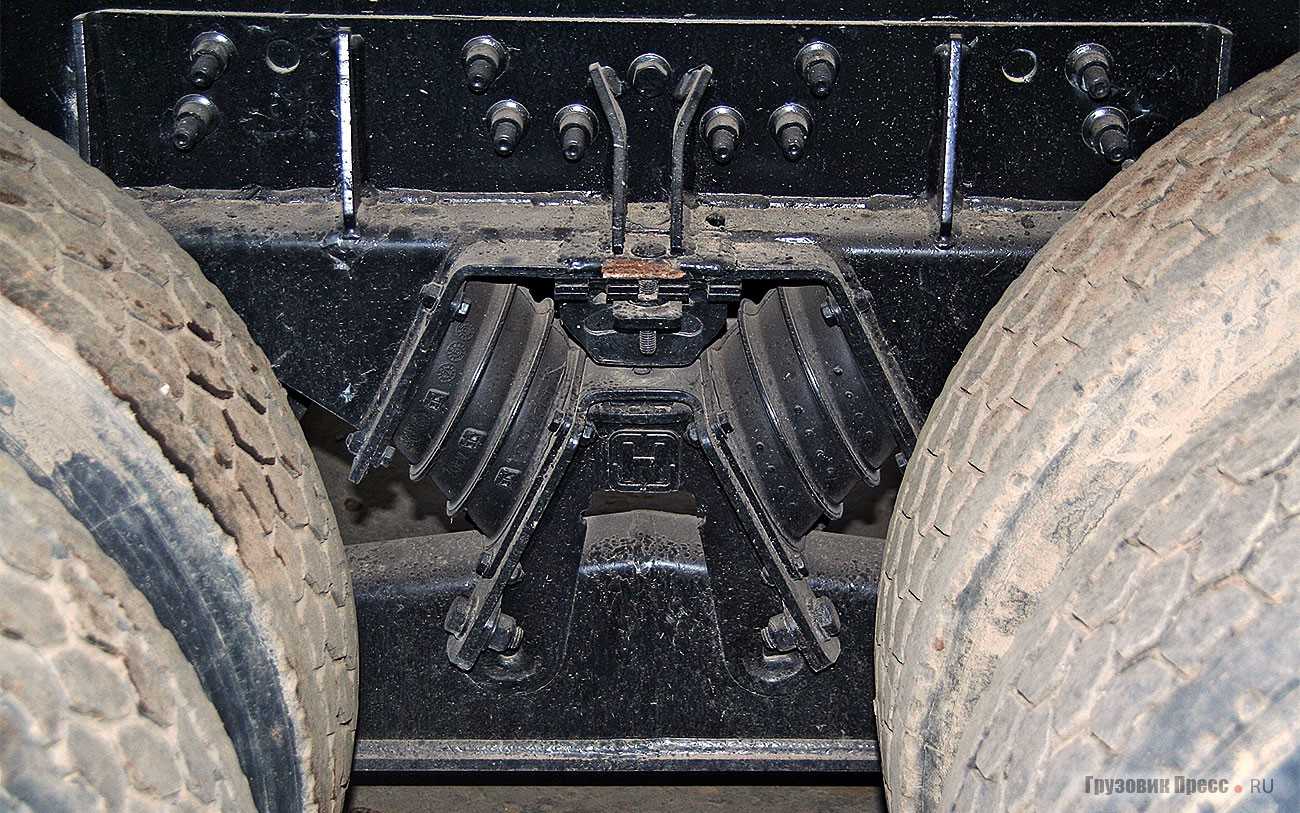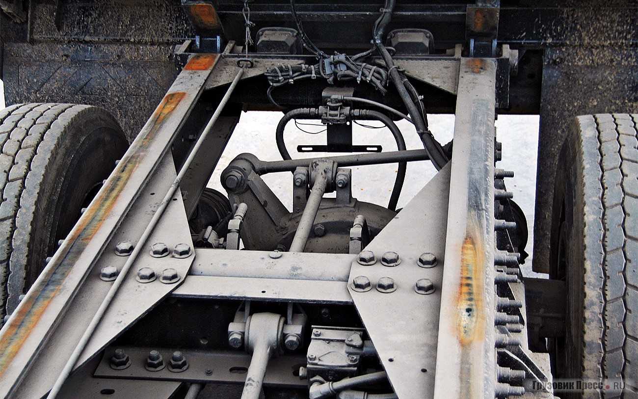 Интересно устроена подвеска самосвала. В конструкции задней тележки отсутствуют рессоры, пружины и пневмобаллоны. Вместо них использованы массивные подушки – вставки из сплошной литой резины. Такая конструкция часто применяется в карьерной технике и шарнирно-сочлененных самосвалах грузоподъемностью 25 т. Она проста и удобна, особенно на скальных карьерных дорогах. Отчасти роль демпфера и амортизатора играют неподрессоренные массы – многослойные шины типа 5L с низкой стираемостью. Впереди применили зависимую подвеску с рессорными пластинами, второй подъемный мост оснащен пневматической подвеской.