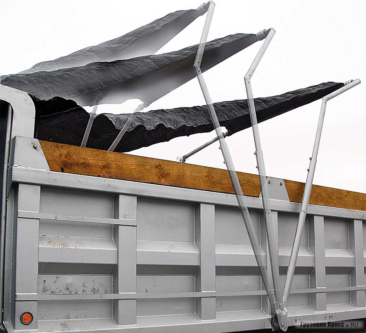 Обзорность не назовешь идеальной: гирлянды зеркал и массивные передние стойки кабины несколько ограничивают видимость. Зато капот вопреки ожидания практически незаметен с кресла водителя и не мешает управлению грузовиком. Установленные на крыльях кабины дополнительные зеркала носят далеко не декоративную функцию. Опережающие справа или слева легковушки в основные зеркала можно и не увидеть. Дополнительные же зеркала расположены значительно ниже, поэтому позволяют отслеживать суету «легковых букашек» вокруг самосвала. Стеклоподъемникам и регулировкам зеркал с электроприводом не удивился, хотя в США еще встречаются машины и без них. В базовую комплектацию входят центральный замок и кассетная магнитола. Из приятных особенностей отмечу возможность автоматического раскладывания и смотки кузовного тента. Достаточно нажать на кнопку – и тент захлопнется над платформой с помощью мощных пружин. Для возврата стоек тента в исходное положение использован сервопривод. Он скручивает тент и фиксирует на козырьке надстройки.