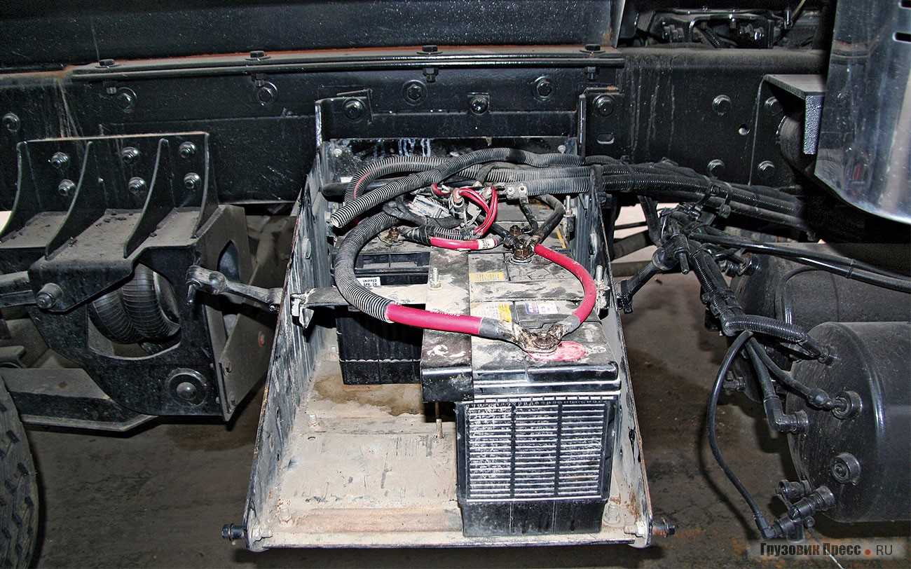 Пустить силовой агрегат сразу не удалось. Машину долго переправляли по морю, потом она стояла на парковке, и АКБ полностью разрядились. Из-за особенностей конструкции североамериканских грузовиков решить эту проблему удалось легко. В аккумуляторном ящике размещено четыре «легковых» батареи. Бортовое напряжение на «американцах» 12 В, и все они подключены параллельно. Такая конструкция имеет массу плюсов. Вопервых, при необходимости можно использовать заряднопусковое устройство от легкового автомобиля. Во-вторых, в случае замены они обойдутся владельцу дешевле грузовых. В-третьих, с ними просто удобнее работать и даже в случае отсутствия или выхода из строя одной-двух батарей машину можно завести.