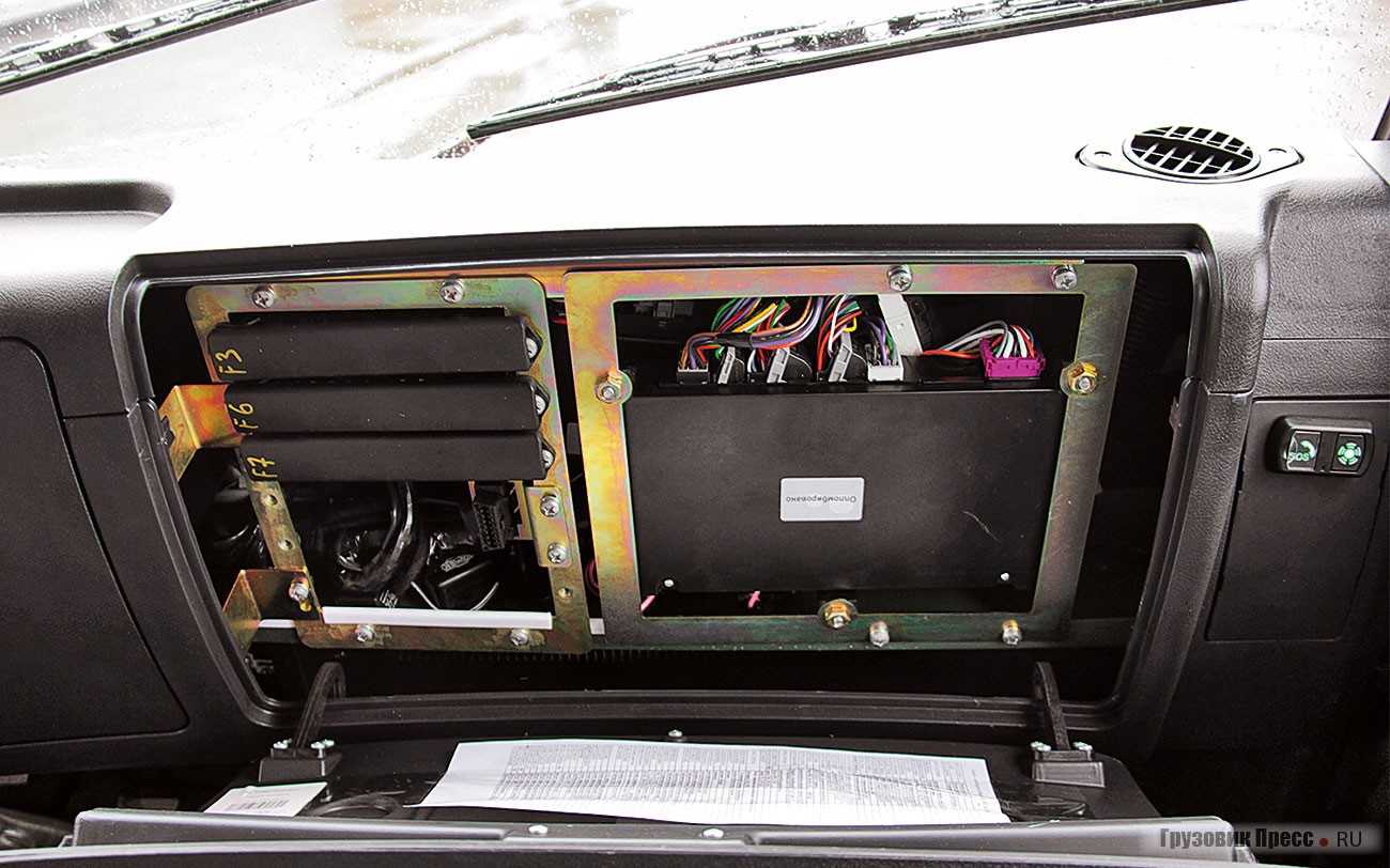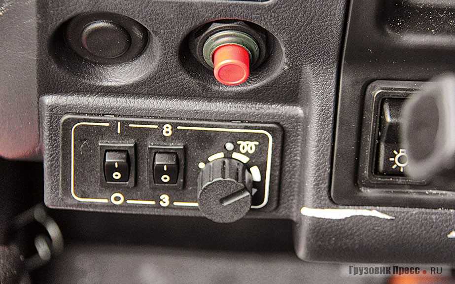 Передняя панель мягкая, скроена ладно, но отдельные элементы оборудования кабины выдают возраст конструкции, как и присутствующий местами голый металл, острые углы которого заботливо оторочены полимерными профилями и резиновыми уплотнителями. Вертикальная педаль сцепления с резьбовой муфтой ограничения хода мне совсем не нравится. Не в восторге я и от грубых регуляторов отопления и вентиляции. От расположенной в центре под торпедо снизу крашеной в чёрный цвет жестяной панели с краном «ручника», переключателями блокировок и пуповиной пневмозамка рулевой колонки.