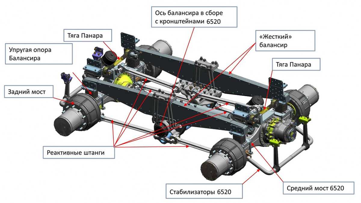 Трёхосный грузовик КАМАЗ-6520-26012-53 с колёсной формулой 6х4 обладает грузоподъёмностью в 20 т. У него рессорная подвеска на передней оси и рессорно-балансирная для задней тележки. Балка передней подвески рассчитана на нагрузку 7500 кг. По сравнению с балкой КАМАЗ-65115 здесь шкворни увеличенного диаметра и бронзовые втулки вместо игольчатых подшипников – так надёжнее, к тому же есть некоторый запас на вероятный перегруз. Грузоподъёмность задней тележки – 25 600 кг. Длина базы – 3600+1440 мм. Спереди и сзади предусмотрены стабилизаторы поперечной устойчивости.