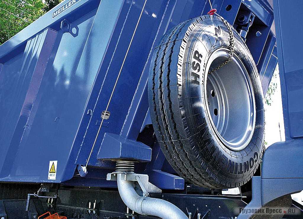 Запасное колесо, как и у большинства самосвалов, крепится на кузове. Чтобы обезопасить водителя при работе с ним, специально выбрали лебедку ALCO kober, оснащенную грузоподъемным тормозом.
