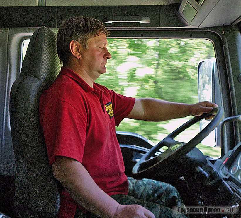 Маневрирование в стесненных условиях расцениваю как очень достойное. Основные зеркала позволяют прекрасно контролировать ситуацию по бокам, а дополнительные секции довольно точно передают информацию, как из района задних колес, так и из правой «мертвой зоны». Благодаря высокой посадке удается заранее спрогнозировать ситуацию впереди, а с учетом компоновки кабины уверенно контролировать правый передний угол. Получению высшего бала в этой дисциплине помешал 12-метровый автобус MAN Lion’s Coach, который накануне с легкостью развернулся в один прием там, где я на грузовиках обычно раскручиваюсь за два.