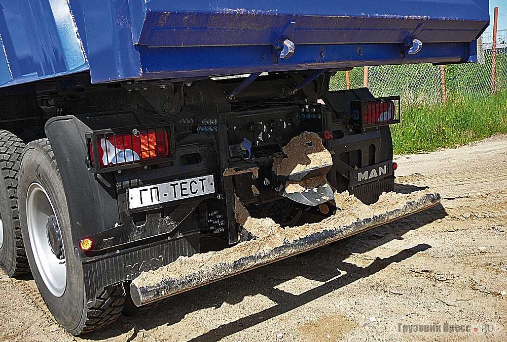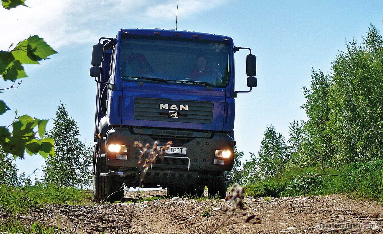 Подходя к самосвалу MAN TGA в первый раз, главное – не вступать в споры по поводу колесной формулы. Со стороны с вероятностью 90 % хочется утверждать, что он полноприводный. Но внешность обманчива, а привод здесь задний. Просто относительно земли машина сидит очень высоко и поэтому производит впечатление хорошего проходимца. Впрочем, в активе TGA есть блокировка межколесных и межосевого дифференциалов мостов, а перед радиатором установлена защитная решетка от камней. Углы въезда и съезда достаточно большие, а радиус продольной проходимости наоборот относительно малый. Так что кое-какие задатки для движения вне дорог все же есть.