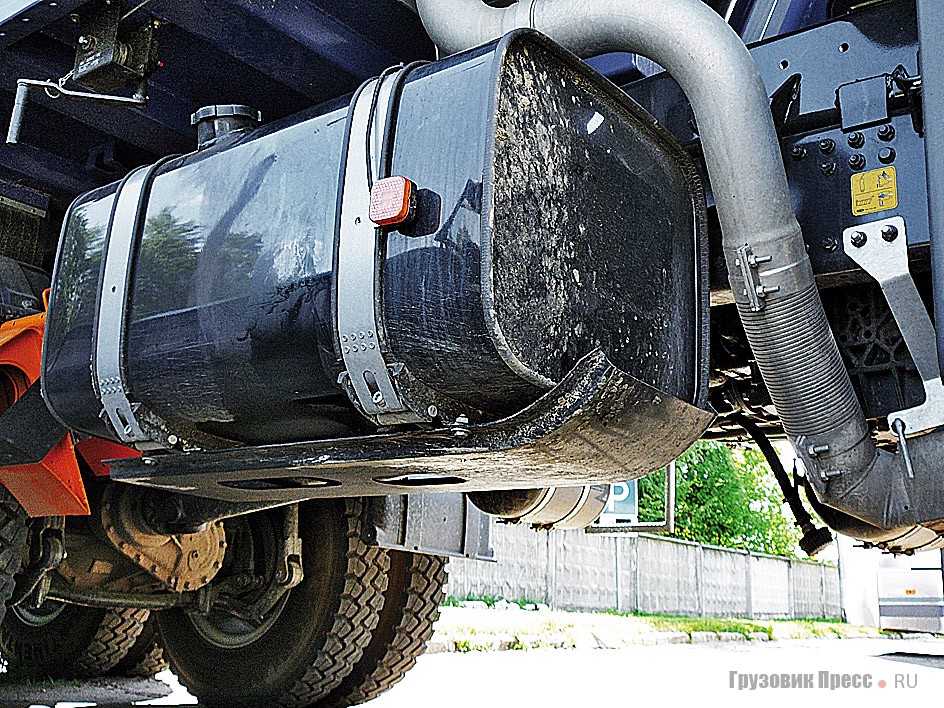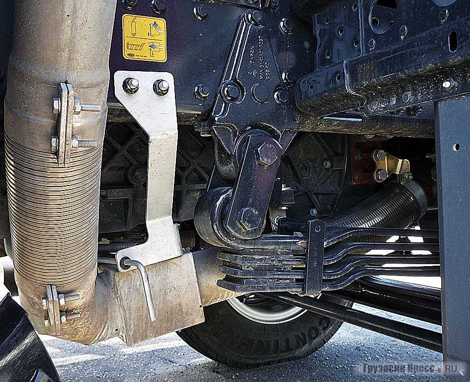 Об обогреве кузова можно было бы и не упоминать, к тому же он подводится к середине передней части днища. Во-первых, это позволяет равномерно обогревать как левую, так и правую сторону кузова, а во-вторых, не зависеть от места расположения выхлопной трубы базового шасси. Но именно здесь был обнаружен один из двух недостатков в конструкции. Если у IVECO глушитель расположен справа и при выводе вверх никому не мешает, то на Actros выхлопная слева и направлена прямо на кузовную лестницу. Своеобразную рекламу Euro 4, размещенную буквально под носом, водитель, конечно, не оценит, но, по словам заводчан, это просто недоразумение: верхнюю насадку можно развернуть в любую сторону, надо лишь ослабить хомут. Надеемся, что так оно и есть, иначе и тент постоянно будет в копоти, и натягивать его никто не полезет.