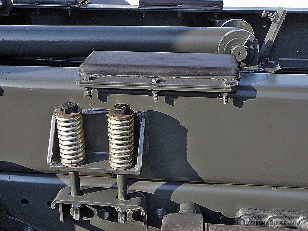 Для того чтобы кузов «не промахивался» при опускании мимо рамы, на ней установлены широкие резиновые подушки, выполняющие одновременно роль прокладок, а на самой платформе в местах соприкосновения с ними наварены дополнительные пластины. В результате не нужны направляющие штифты. Лоток для работы с асфальтоукладчиком сделан съемным, ведь не так часто выполняются подобные работы, а возить с собой балласт ни к чему.