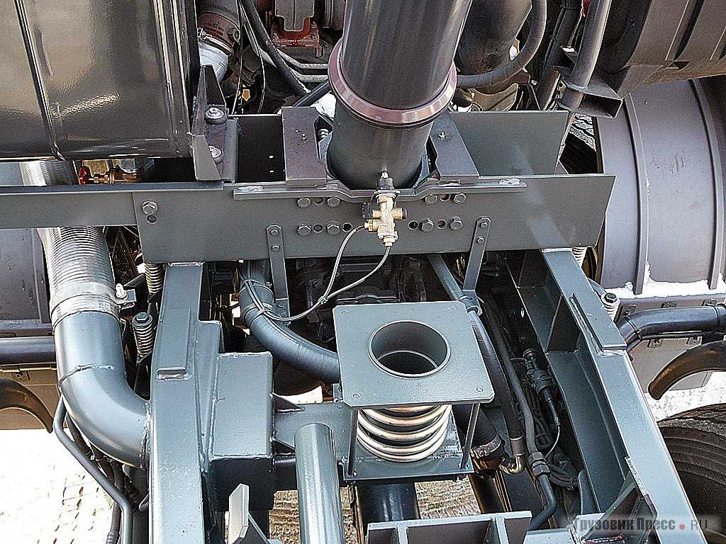 Об обогреве кузова можно было бы и не упоминать, к тому же он подводится к середине передней части днища. Во-первых, это позволяет равномерно обогревать как левую, так и правую сторону кузова, а во-вторых, не зависеть от места расположения выхлопной трубы базового шасси. Но именно здесь был обнаружен один из двух недостатков в конструкции. Если у IVECO глушитель расположен справа и при выводе вверх никому не мешает, то на Actros выхлопная слева и направлена прямо на кузовную лестницу. Своеобразную рекламу Euro 4, размещенную буквально под носом, водитель, конечно, не оценит, но, по словам заводчан, это просто недоразумение: верхнюю насадку можно развернуть в любую сторону, надо лишь ослабить хомут. Надеемся, что так оно и есть, иначе и тент постоянно будет в копоти, и натягивать его никто не полезет.