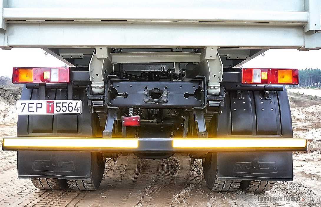 Дополнительно самосвал может оборудоваться прицепом, преобразующим модель в автопоезд. Передовая система фиксации обеспечивает надежную работу, а подключаемые электроэлементы позволяют подсветить борт.