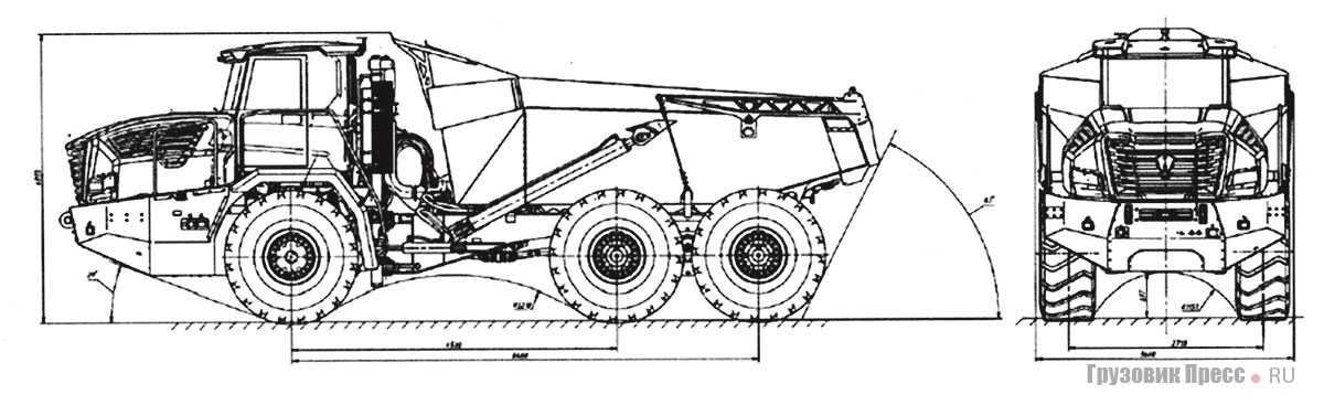 Из-за ширины в 3,43 м и превышения разрешённой осевой нагрузки самосвал не может передвигаться по дорогам общего пользования, если не оформлен допуск или трасса не является смежной технологической дорогой. Допустимую высоту (3,94 м) конструкторы выдержали. Длина машины в транспортном состоянии составляет 10,12 м, что вполне соответствует американским и европейским аналогам. Поворот самосвала осуществляется изменением угла передней полурамы относительно задней. Внешний радиус поворота у машины таких габаритов совсем небольшой – 8,9 метра. Дорожный просвет более чем впечатляющий – 517 мм.