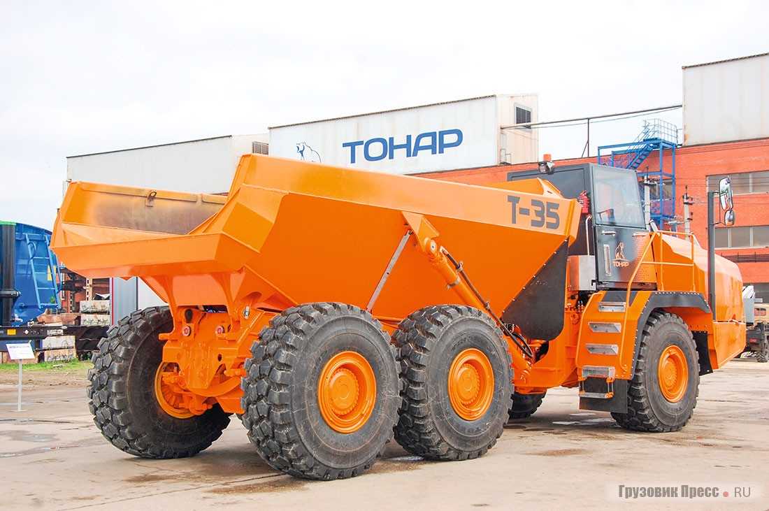 По размерам (11,25 х 3,24 х 3,82 м) машина получилась внушительной, но укладывается в рамки типоразмера Volvo, Caterpillar и Bell. И, к слову сказать, реальным ограничением у Т-35 выступают только шины. По секрету сообщили, что готовится и 40-тонная модификация Т-40 с усиленными покрышками! От обилия таких новостей автожурналисты без хлеба точно не останутся!