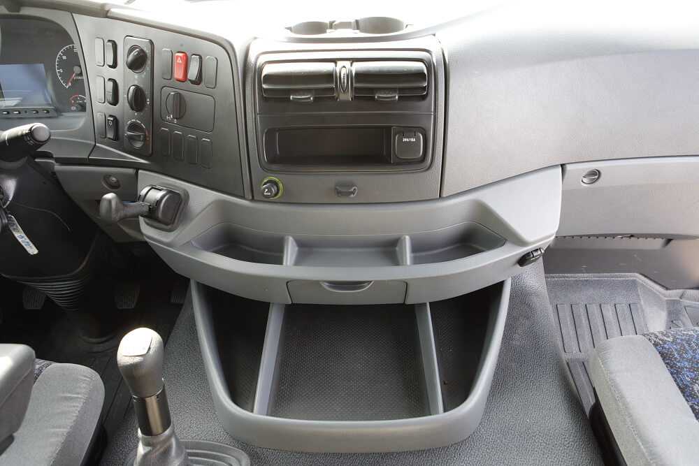 Приятно порадовала установка подлокотников, что очень кстати, учитывая, что поездки могут быть очень длительными. Возле себя можно обнаружить пару подстаканников, ручку коробки переключения скоростей и рычаг ручного тормоза. Приборная панель получила антибликовое покрытие. Базовое оснащение имеет автономное отопление и аудиосистему.