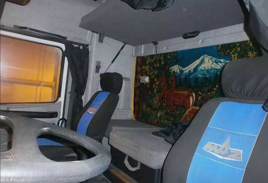 В целом, кабина МАЗ-6430 не уступает зарубежным аналогам. Это действительно функциональный трактор, прекрасно подходящий для длительных поездок. Для отделки кабины были использованы практичные материалы, устойчивые к механическим повреждениям и легкие в уходе. В салоне имеется большое количество ящиков, ниш и отсеков для хранения личных вещей, проездных билетов, документов и т.д.