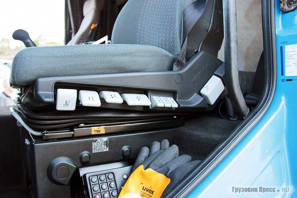 В кабине large-sized high roof обалденный простор, дотянуться до некоторых ниш потолочного модуля не так просто (мой рост 176 см). Рулевая колонка регулируется механически, но в двух направлениях, водительское кресло на пневмоподвеске ничем не уступает нынешним, а у сменщика справа плюс ко всему ещё и удобная подставка для отдыха ног. Едется мне вольготно и удобно.
