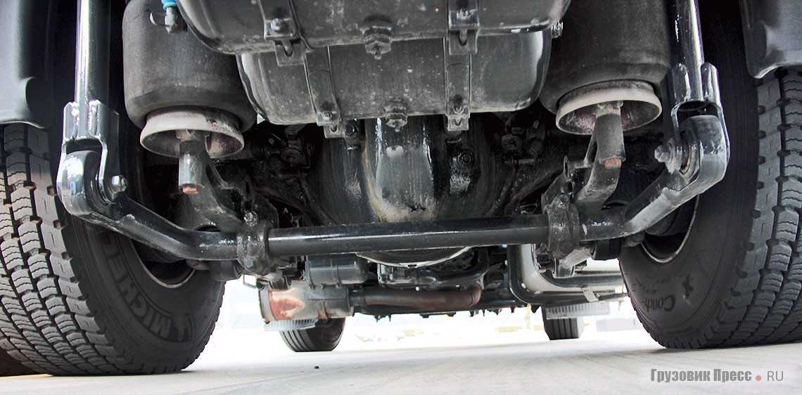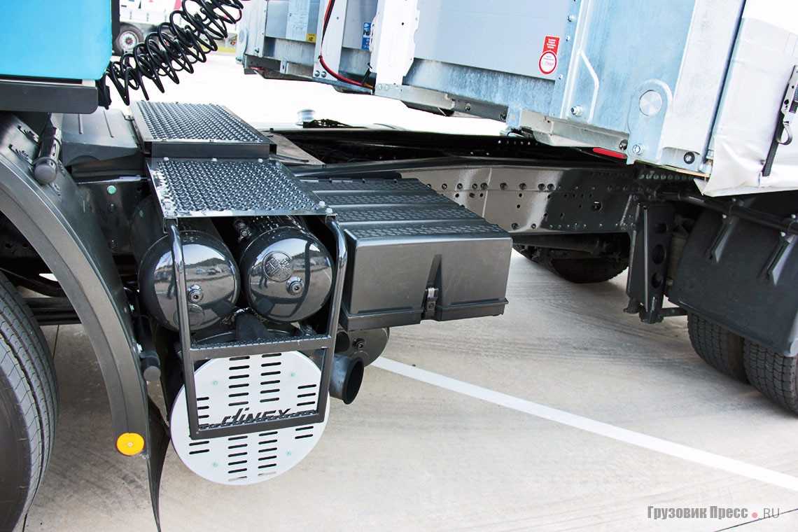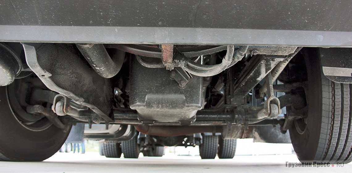 Грузовик оснащён серьёзными противоподкатными брусьями с обеих боков. Это неплохо, но несколько затрудняет доступ к запасному колесу. Для снятия запаски специального приспособления не предусмотрено: требуется открутить две гайки — и колесо тогда просто упадёт на землю.