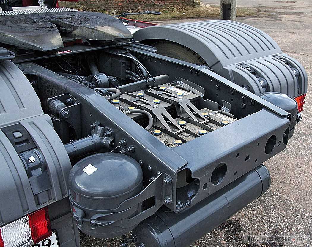 Этих самых особенностей в новом «седельнике» хоть отбавляй. Например, расположенные в заднем свесе аккумуляторные батареи. Им просто не нашлось места возле топливных баков, ведь там сейчас емкость с мочевиной. А с другой стороны расположен огромный сундук нейтрализатора выхлопных газов, где и происходит химическая реакция раствора AdBlue и вредных частиц. Из-за этого допоборудования АКБ перекочевали в задний свес. Единственным вариантом сохранения батарей на более привычном месте мог стать отказ от установки второго топливного бака. Но и это не лучшее решение, ведь для проверки состояния аккумуляторов водителю теперь придется расцепить автопоезд – по-другому до ящика АКБ не добраться. И если в Европе туда совать нос не рекомендуют, то в холодной России за аккумуляторами следить жизненно необходимо. Кстати, для решения этой проблемы инженеры опять применили электронику, установив блок контроля за состоянием батарей. Он контролирует силу тока, напряжение, температуру наружного воздуха. Анализируя эти показатели, блок выдает информацию о состоянии АКБ. Не слишком ли много чести для обычных аккумуляторов? Зато суммарный объем двух топливных баков составляет 1300 л.