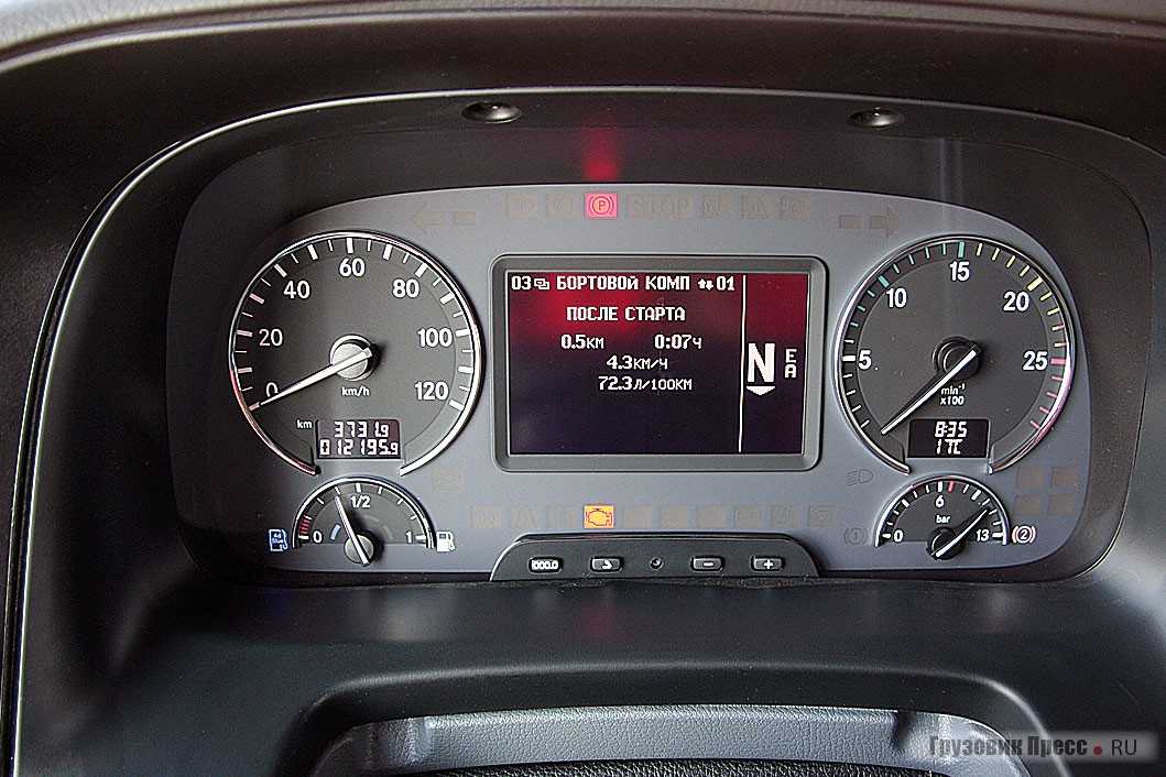 Отдельная тема для разговора — мерседесовская система телематики и самодиагностики FleetBoard Uptime, которая отслеживает абсолютно все, что происходит с автомобилем и водителем. Mercedes-Benz Actros самостоятельно оценивает до 500 алгоритмов — от технического состояния почти всех систем тягача до манеры вождения водителя — и выставляет последнему оценки, отправляя отчеты как владельцу компании, так и обслуживающему грузовик дилеру, а также непосредственно в «Даймлер КАМАЗ Рус» (доступ настраивается владельцем).