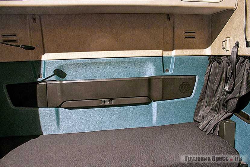 Спальное место у новинки длиной 200 см, шириной 70 см, а толщина матраса 16 см. Такая «антропометрия» позволяет вообще безо всяких проблем с удобством улечься человеку любой комплекции. Как и во всех хороших тягачах, здесь предусмотрены индивидуальные световые приборы и продублированы некоторые клавиши, по современным меркам, ничего особенного, но материалы обивки качественные, сделано всё очень аккуратно.