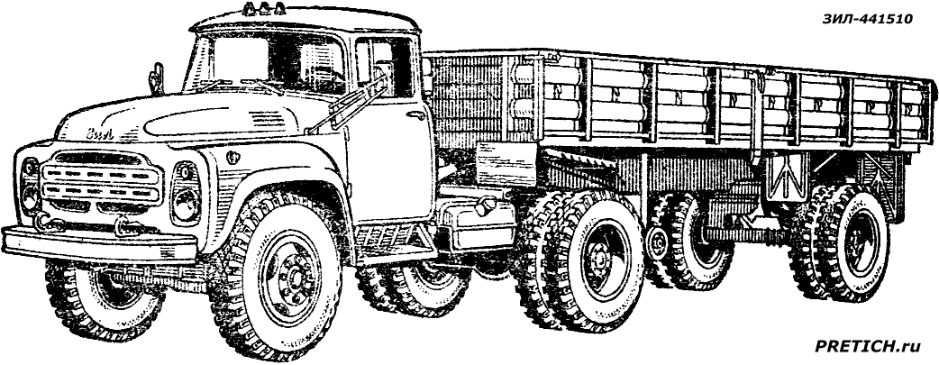 Седельный тягач ЗИЛ-441510 (рис. 3) с базой 3300 мм предназначен для буксирования различных полуприцепов с грузом. Полная масса автопоезда, включая массу полуприцепа, 18 660 кг при эксплуатации по всем автомобильным дорогам.