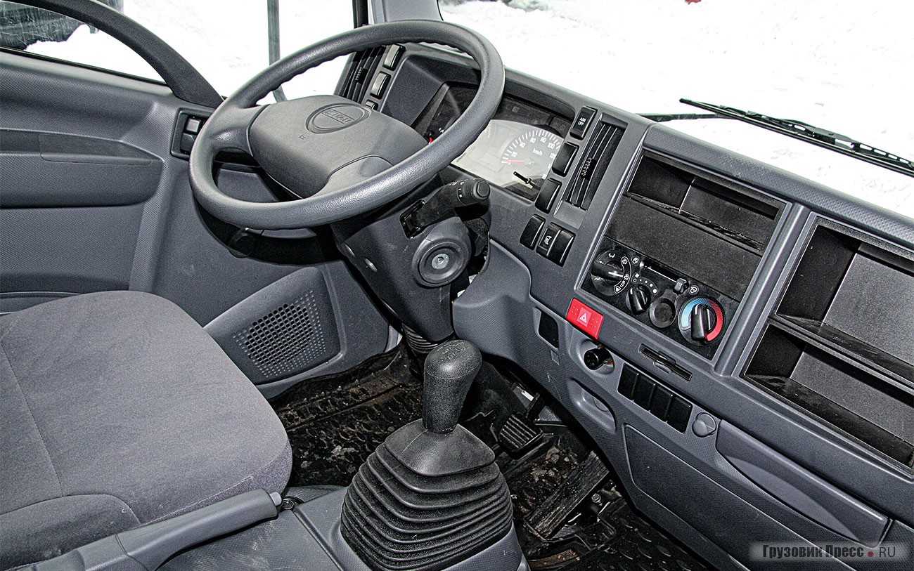 Панель приборов незамысловата и выполнена в виде единого блока. Вниманию водителя представлены только спидометр, тахометр, датчики температуры и уровня топлива. Работу остального оборудования контролирует электроника, и в случае каких-либо неисправностей на панели загорится соответствующая пиктограмма. Из различий отметим, что в малотоннажнике базовая комплектация включала электрические стеклоподъемники. На более тяжелом Isuzu NMR 85 такое оборудование доступно лишь в виде опции. Зато все машины в заводской комплектации оснащены подогревом зеркал заднего вида.