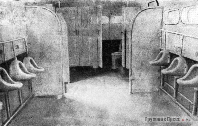Мужской и женский туалеты выполнялись в разных фургонах и отличались друг от друга различной планировкой и расстановкой санитарных приборов: в мужской уборной – 3 кабины с унитазами, 2 умывальника и 12 писсуаров, а в женском – 8 кабин с унитазами и 2 умывальника. В каждом имелось по хозяйственной кабине, санитарно-гигиеническому шкафу, откидному сидению для обслуживающего персонала и 2 зеркалами у умывальников.