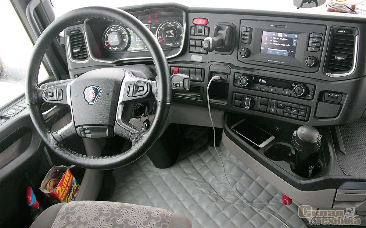Данную модель отличает исключительно комфортная и функциональная кабина, практически идеальная для магистрального седельного тягача. Многие водители-дальнобойщики по праву считают салон кабин магистральников Scania одним из самых привлекательных рабочих мест в мире. Внутреннее пространство кабины отличается выверенной эргономикой, очень качественными материалами отделки и функциональностью во всём. Это истинная зона комфорта.