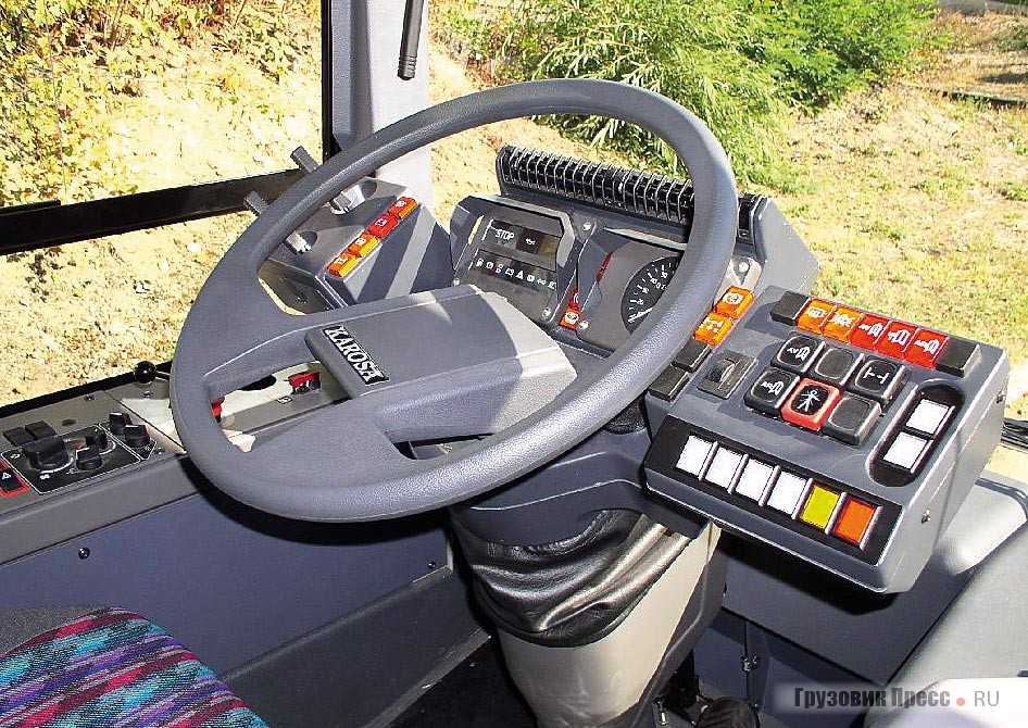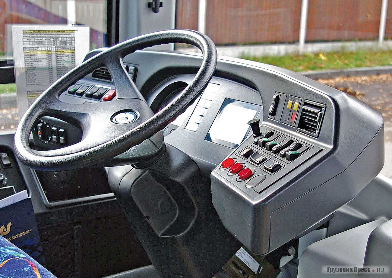 Первое, что бросается в глаза: на 24Тr в сравнении с рядом стоящими польскими троллейбусами Solaris – это нагромождение пластиковых деталей во внешней отделке кузова. Из-за достаточно большого закрытого заднего отсека, где расположено все электрооборудование, включая двигатель и компрессор, зона освещенности на задней площадке гораздо меньше, чем у Solaris. Эргономика рабочего места водителя соответствует нормам. Все основные тумблеры и джойстики управления – под рукой, доступ к ним не вызывает сложностей. Панель приборов с изменяемым углом наклона. Как и на многих европейских троллейбусах, перегородка кабины водителя открытая, т. е. от пассажиров ее отделяет пластиковая нижняя часть с остеклением наверху.