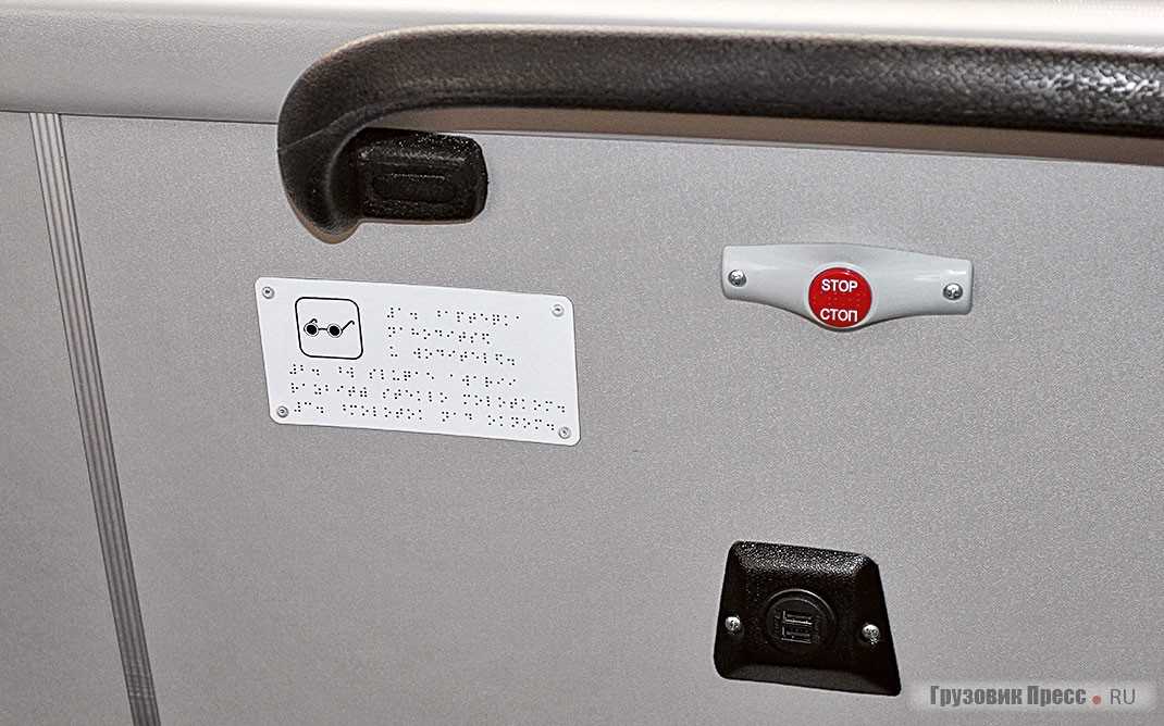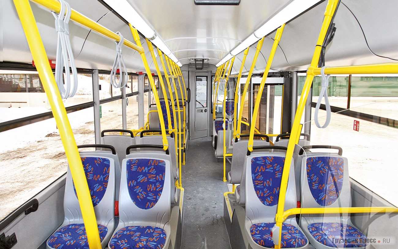 Салон, понятно, всем хорошо знаком по автобусам, хотя и скомпонован несколько по-другому. Посадочных мест – 32 при полной пассажировместимости в 91 человек. Конструкционно продумано грамотно – сиденья либо на подиумах, либо прикреплены к стенам, так что убирать салон будет удобно. А он в свою очередь просторный и светлый. Освещение, конечно, светодиодное, есть разъёмы USB для смартфонов. Неожиданно приятная мелочь – на стенке средней накопительной площадки, рядом с местом для инвалидного кресла, есть дополнительная табличка, выполненная шрифтом Брайля.