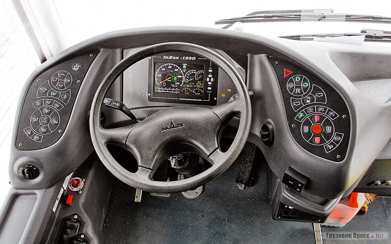 Впрочем, к качеству салона есть и некоторые замечания. Он выполнен традиционно по-белорусски: старательно, но грубовато. Зазоры неровные, стыки заделаны неаккуратно, головки саморезов торчат. Но всё это неважные мелочи, зато обшивка кузова сварена явно с преднатягом: нет ни волн, ни впадин, как на многих кузовах конкурентов. А вот к месту водителя претензий никаких: отличная обзорность, удобное сиденье РИАТ с понятными регулировками, зеркала с электрорегулировкой и подогревом. Клавиши управления собственные, специально защищённые от влаги. Экран, заменяющий панель приборов, тоже хорошо известен, это часть микропроцессорной системы молдавской фирмы Informbusiness. На него можно вывести любую требуемую информацию, от текущих параметров хода до результатов проверки работы ключевых элементов.
