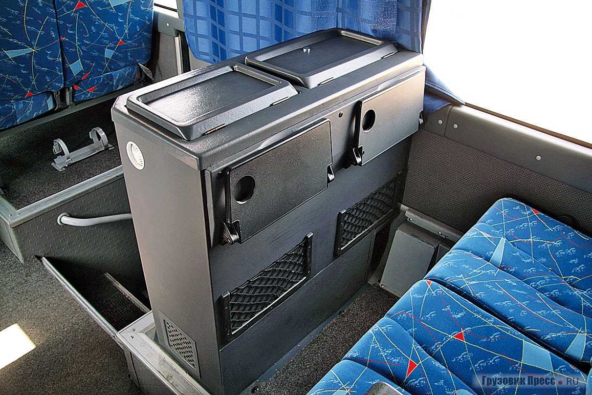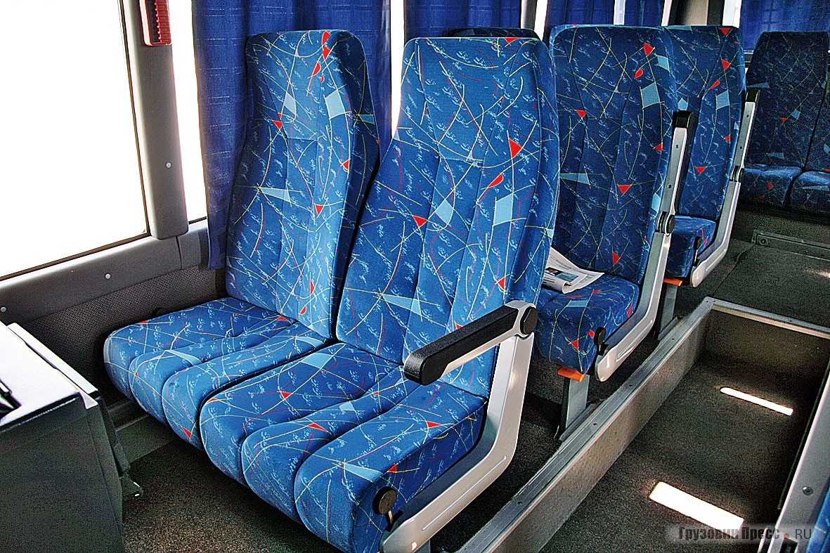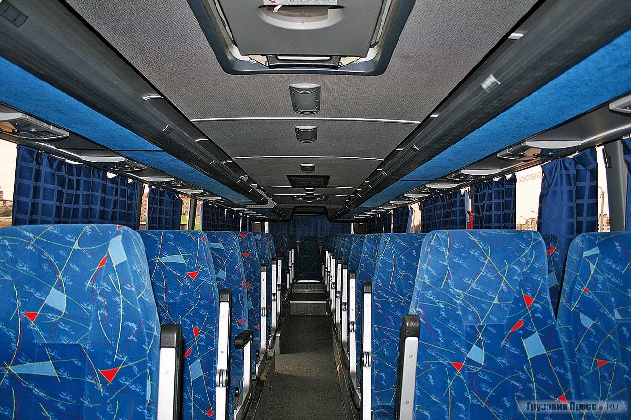 Кресла в салоне обиты велюром – на мой взгляд, это приемлемый компромисс между дорогой кожей и бюджетным гобеленом. Немного смутила жесткость пластика откидного подлокотника. Не хватает откидных столиков – в дальней дороге без них не обойтись. Да и отсутствие мусоросборников создает неудобства: куда девать пустые бутылки, обертки от шоколада и проч.? Ведь это уже становится стандартом в автобусах, работающих на плече в несколько сотен километров.