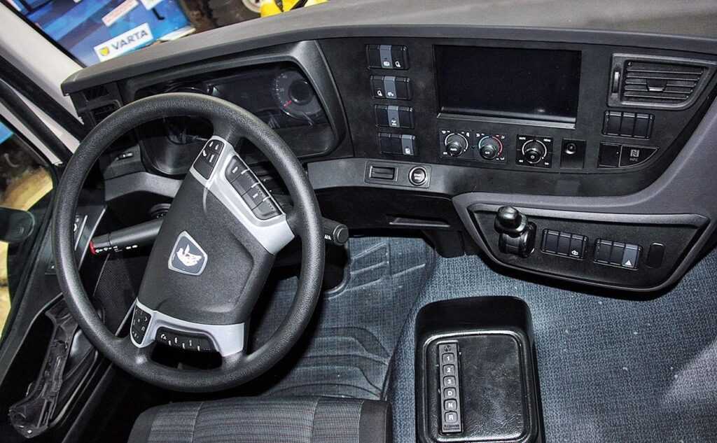 Оказавшись в кабине «Арктики», не заблудишься в лесу рычагов управления полноприводной трансмиссии. Всё упрощено именно для тыкания пальцем в рукавице. Привычная панель приборов, тумбочка под правой рукой с селектором АКП Allison, уютный одноместный «спальник» около задней стенки, а над головой водителя стандартный мультимедийный блок, где предусмотрен даже тахограф!