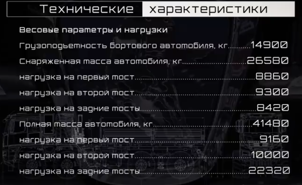Характерная особенность автомобиля, надёжность и пониженные требования в эксплуатации. Изделие с упрощенной конструкцией, подающей солярку, исключена электроника, что помогает запускать мотор в условиях пониженных температур без потери энергии. Силовая установка «740», развивает двести сорок лошадей, соответствует экологическим Евро 2 стандартам. При пробуксовке колёс, между осями предусмотрен дифференциал. Механика с десятью скоростями, отношение числа зубьев ведомой шестерни к числу зубьев ведущей шестерни – 6,53. Грузоподъёмность автомобиля 5,5 тон, возможна буксировка прицепа, массой 2 тонны. Вездеход оборудован двумя ёмкостями для солярки 210 литров каждая, запас хода 800 километров.