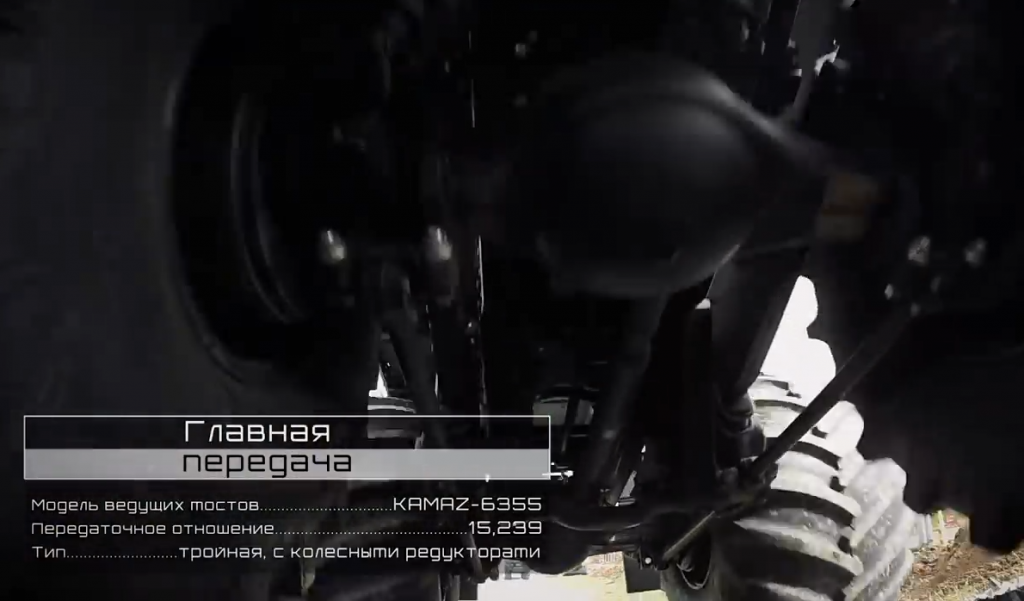 Установлены новые мосты с передаточным числом 1 к 15 оборотам, мосты трехступенчатые. Стоят специальные тихоходные мосты для такого автомобиля. Максимальная скорость такого автомобиля 55 км/ч. Установлена новая раздаточная коробка разработанная заводом КАМАЗ.