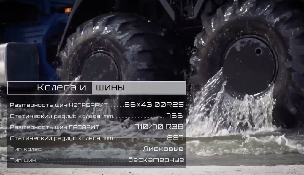 Версии “габарит” будут оснащены шинами Nortec 710/70 R38 (38 дюймов!). Версии “негабарит” получат шины “Днепрошина” размерностью 1000/50R25. Одна такая шина весит 268 кг!