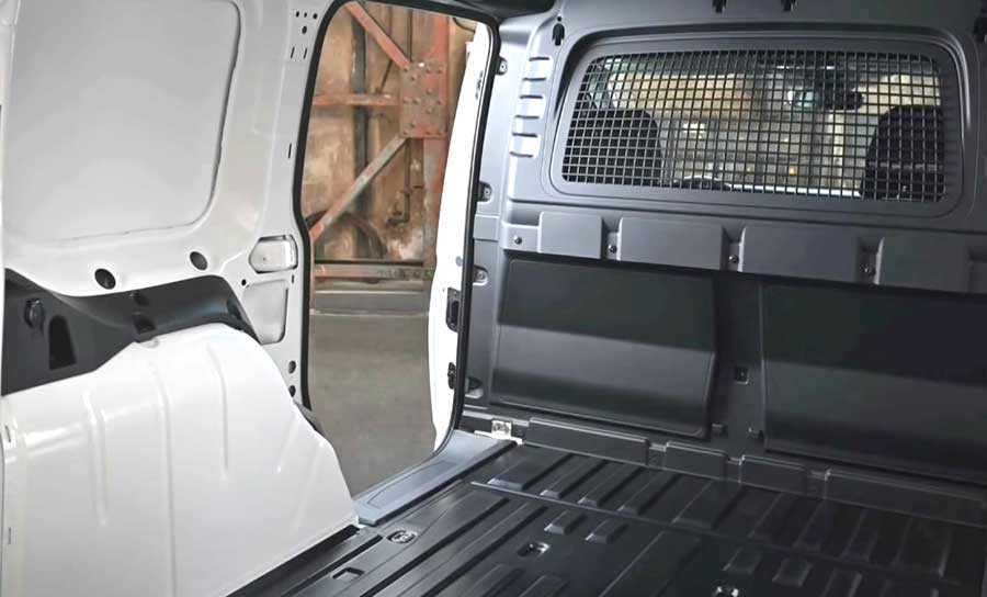 Пассажирские кресла в двухместном фургоне отделены от грузового отделения жесткой пластиковой перегородкой, в которой монтируется решетчатое окно, пол багажного отделения — металлический профиль, без коврика и пластиковой обшивки.